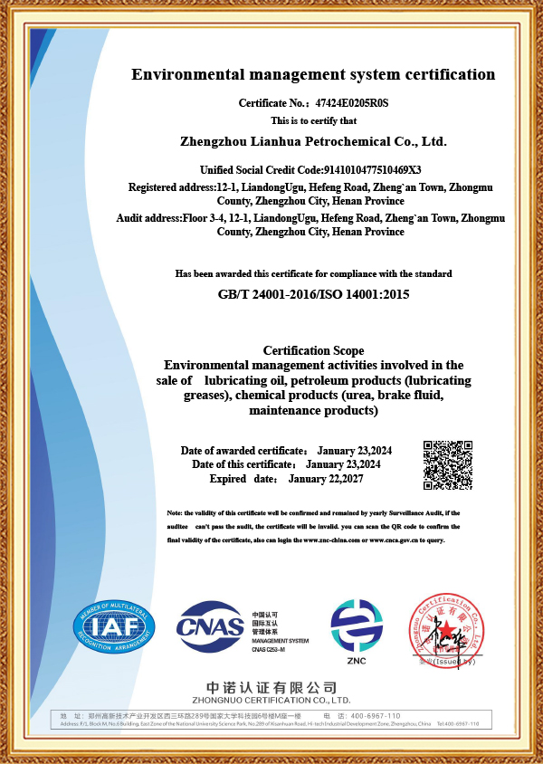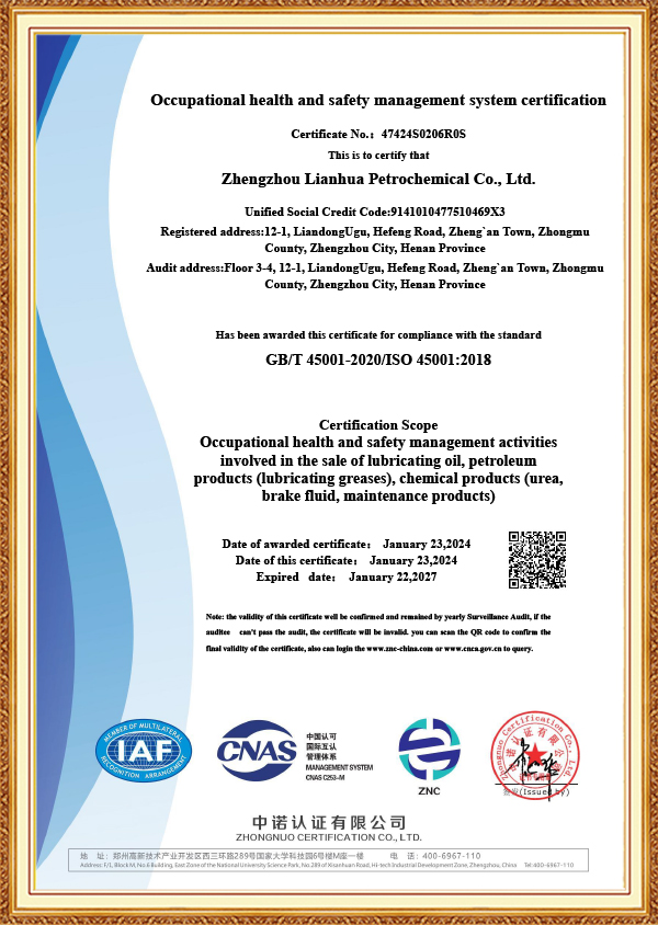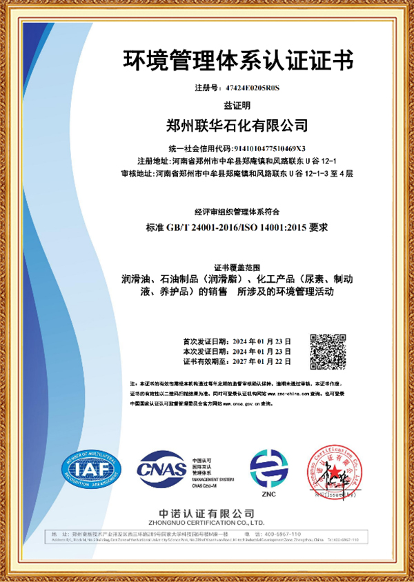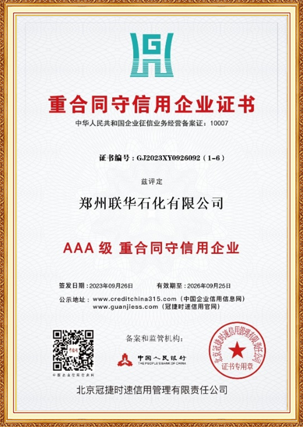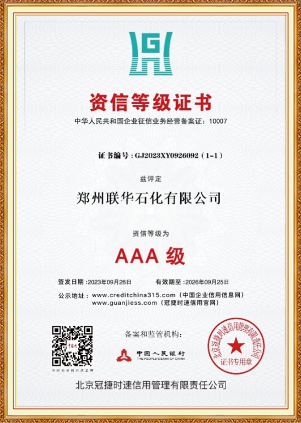 郑州联华石化有限公司秉承“诚信、专业、创新、共赢”的理念,在河南省石化行业中拥有良好的商业信誉、领先的技术优势、先进的营销理念、雄厚的资金实力、完善的服务体系。客户网络涵盖航空、航天、军工、冶金、汽车制造、机械加工、工程机械、农机、矿山、食品、医药、新能源、人工智能等行业。在整合各种优势资源的基础上,本着“诚信经营、互利共赢”的原则,致力于打造立足河南、面向全国的具有核心竞争实力的工业品集成服务专家级企业。我司是河南省设备管理协会新能源和智能润滑分会会长单位;质量、诚信、售后服务国家级AAA 企业; 通过 ISO9001 国际质量管理体系、14001 环境管理体系、45001职业健康安全管理体系认证企业:AAA 级重合同守信用企业;国家信用等级AAA 级单位。